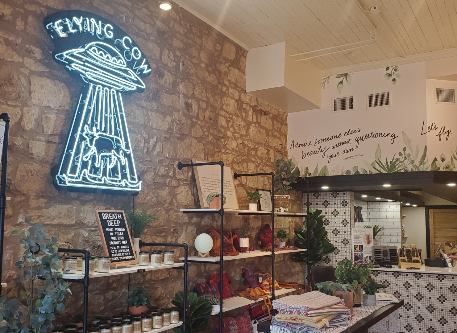 Flying Cow Tallow auf der Main Street in Fredericksburg ist der zweite Standort des kleinen Familienunternehmens, das in Midland, TX, gegründet wurde. Flying Cow hat es sich zur Aufgabe gemacht, die besten Hautpflegeprodukte mit den hochwertigsten Inhaltsstoffen zu liefern. Die handgefertigten Balsame lindern eine Vielzahl von Hautproblemen ohne künstliche Chemikalien oder Zusatzstoffe. Flying Cow verwendet die frischesten Zutaten, die von kleinen Bio-Bauernhöfen bezogen werden. Sie sind sehr stolz darauf, dass jedes Produkt von Hand hergestellt, abgefüllt und etikettiert wird.