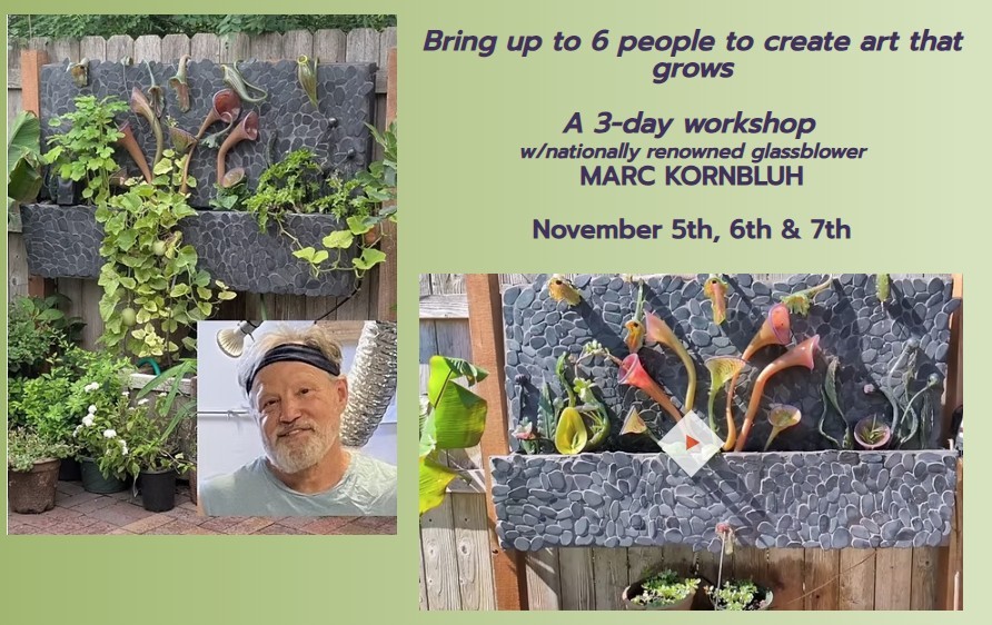 Während seines Besuchs wird Kornbluh einen dreitägigen "Build & Blow"-Workshop (5.-7. November) leiten, bei dem die Teilnehmer ihren eigenen solarbetriebenen Hydrokultur-Pflanztopf herstellen und Glasblumen für den eingebauten Springbrunnen blasen werden. Die Anmeldung für den Workshop ist geschlossen, aber Beobachter sind willkommen, sich die Anleitungen anzusehen und die Glasblumen zu bestellen, um sie selbst zu bauen. Eine Voranmeldung zum Zuschauen ist erforderlich.