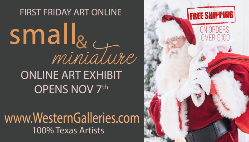Die Western Galleries in Fredericksburg, Texas, veranstalten ihre alljährliche Weihnachts-Online-Kunstausstellung mit kleinen und miniaturisierten Original-Kunstwerken ausgewählter lokaler und texanischer Künstler. Diese First Friday-Ausstellung wird am 7. November auf WesternGalleries.com eröffnet. Sie können die Kunstwerke online kaufen oder Western Galleries kontaktieren, um einen Termin für eine persönliche Besichtigung zu vereinbaren. WG-Geschenkkarten werden akzeptiert, und siehe Warenkorb für kostenlosen Versand in die USA.