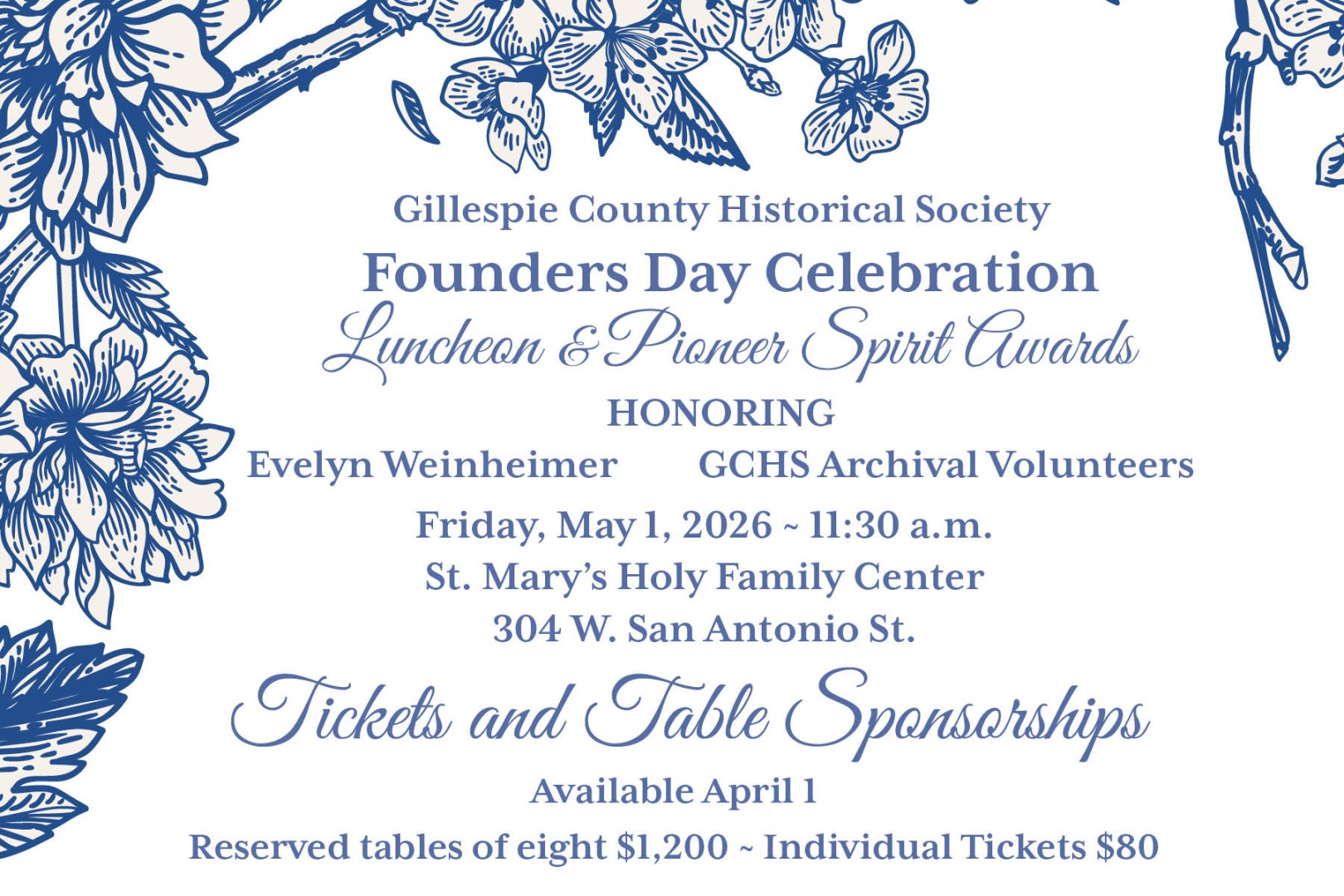 Join us as we celebrate Founders Day in Fredericksburg with a special luncheon honoring history and heritage. During the lunch, the 2026 Pioneer Spirit Award winners will be honored.