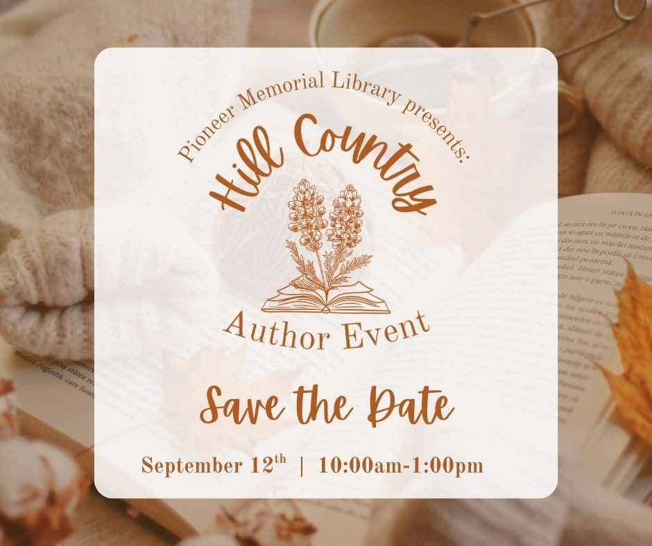 The Pioneer Memorial Library will be hosting the first annual Hill Country Author Event for local authors in the Texas Hill Country area. This event will be held on Saturday, September 12th from 10:00am-1:00pm. There will be tables for authors to meet-and-greet readers and sign books. Children's book authors will be given an opportunity to have a small reading of their book to children.