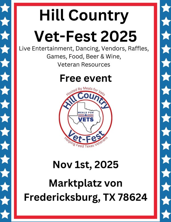 Meals for Vets freut sich, seine zweite jährliche Benefizveranstaltung, das Hill Country Vet-Fest, ankündigen zu können. Auf dem Programm stehen großartiges Essen, Bier und Wein, Hüpfburgen, Gesichtsbemalung, zahlreiche Verlosungen, Spiele, Anbieter, Veteranen-Ressourcen, Live-Musik und Tanz den ganzen Tag und Abend über. Kommen Sie zu einer kostenlosen Veranstaltung, die Spaß macht und einen guten Zweck unterstützt. Für weitere Informationen, Sponsoring-Möglichkeiten oder Spenden können Sie uns gerne unter (830) 992-3375 oder info@mealsforvets.org kontaktieren.
