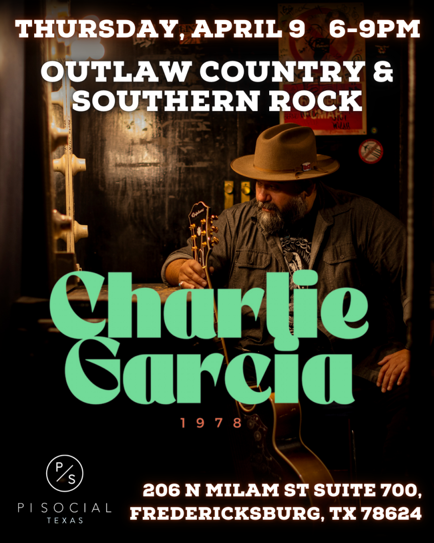 Get ready for a night of electrifying outlaw country and southern rock with Charlie Garcia on Pi Social's patio from 6 p.m. - 9 p.m.! Dive into the gritty, soulful sounds that define one of Fredericksburg's hot spot destinations.