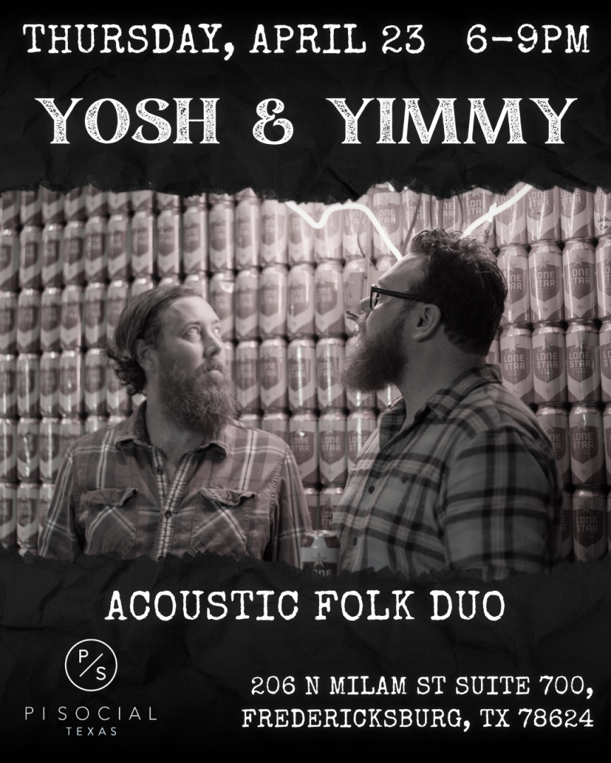 Let the harmonies of Yosh & Yimmy, a due fronted by the talented Josh Glenn, serenade you on Pi Social's patio from 6 p.m. - 9 p.m! Dive into an eventing filled with acoustic folk, melodies that promise to touch your sound and lift your spirits. Join us at one of Fredericksburg's premier hot spot destinations for a night of live music, love, and unforgettable memories.