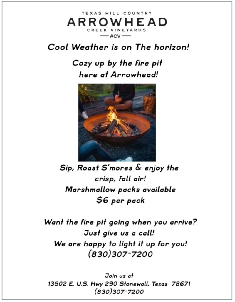 Einladung zur offenen Feuerstelle @ Arrowhead Vineyards13502 E. U.S. Highway 290