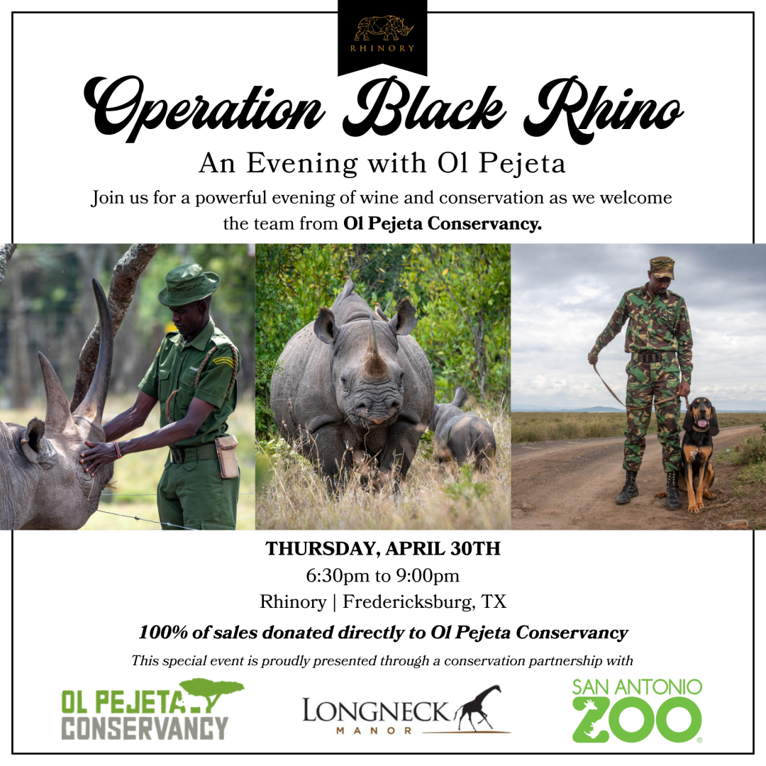 In partnership with the San Antonio Zoo and Longneck Manor, we would like to invite you to an unforgettable evening of wine and conservation as we welcome the team from Ol Pejeta Conservancy, the sanctuary that protect the largest population of black rhinos in Eastern Africa and cares for the last two remaining northern white rhinos on Earth.