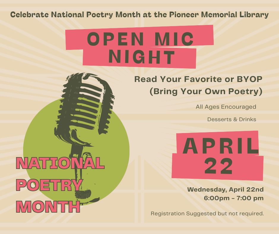 In honor of National Poetry Month, the Pioneer Memorial Library will be holding an Open Mic Night on Wednesday, April 22nd from 6:00pm - 7:00pm.